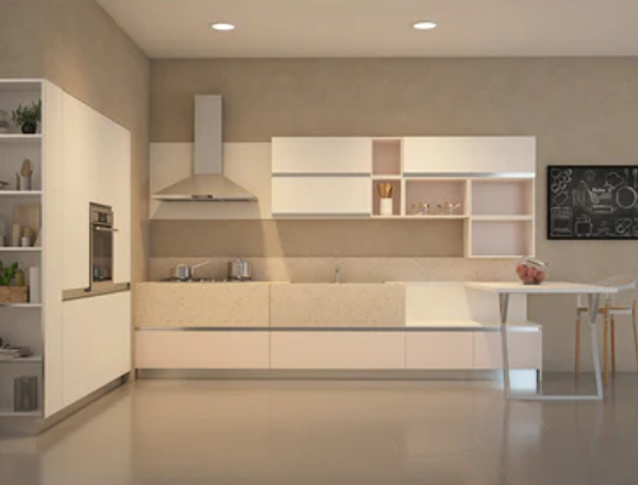 Cabinets: a wide set of cabinet permutations are customized to fit your kitchen space. From an array of corner solutions, base, wall, ladder units and open shelving to cater to the odd space and breaking the monotony.